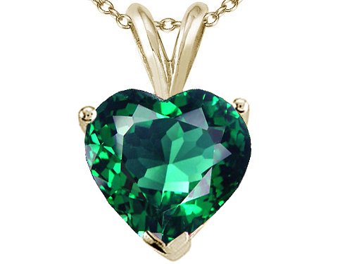 Genuine Lab Created Heart Emerald Pendant crafted in 14 kt Yellow Gold Dimensions: Width: 8.00 mm Length: 15.00 mm1 Stone 2.00 Carats Lab Created Heart Shaped 8mm Color: Green Clarity: Clean Free 18 inches chain included FREE LIFETIME WARRANTY, GIFT BAG AND GIFT CARD! Finejewelers Style Number: 25818.